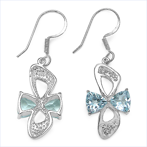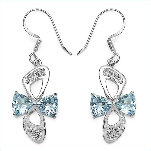 In diesen extravaganten Ohrringen in Schleifenform wurden jeweils zwei 7,00 mm großer hellblaue Topas im Trillion-Schliff perfekt eingefasst.
