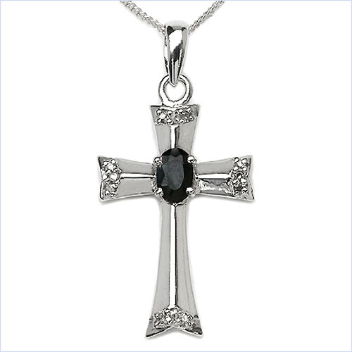 Collier/Halskette mit Kreuz - Anhänger 12 Diamanten/ 1 Black Saphir - 925 Sterling Silber-Rhodiniert 0,83 Karat