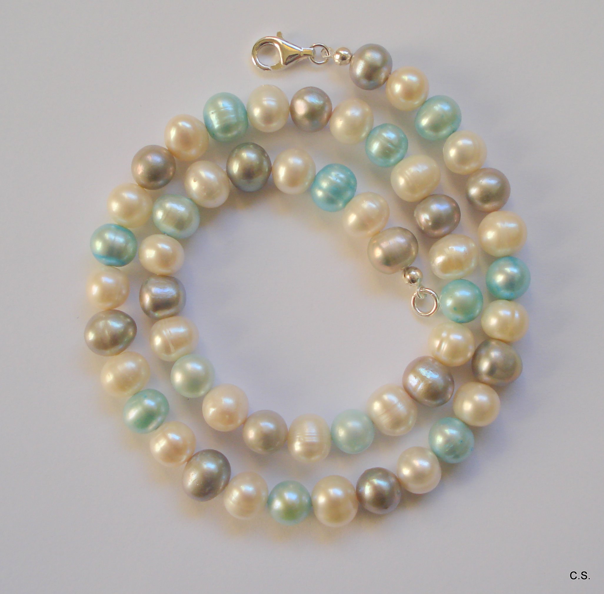 Die türkise und Graue glänzende Farbe erhielten die feinen Perlen durch ein 9 monatiges Farbbad.