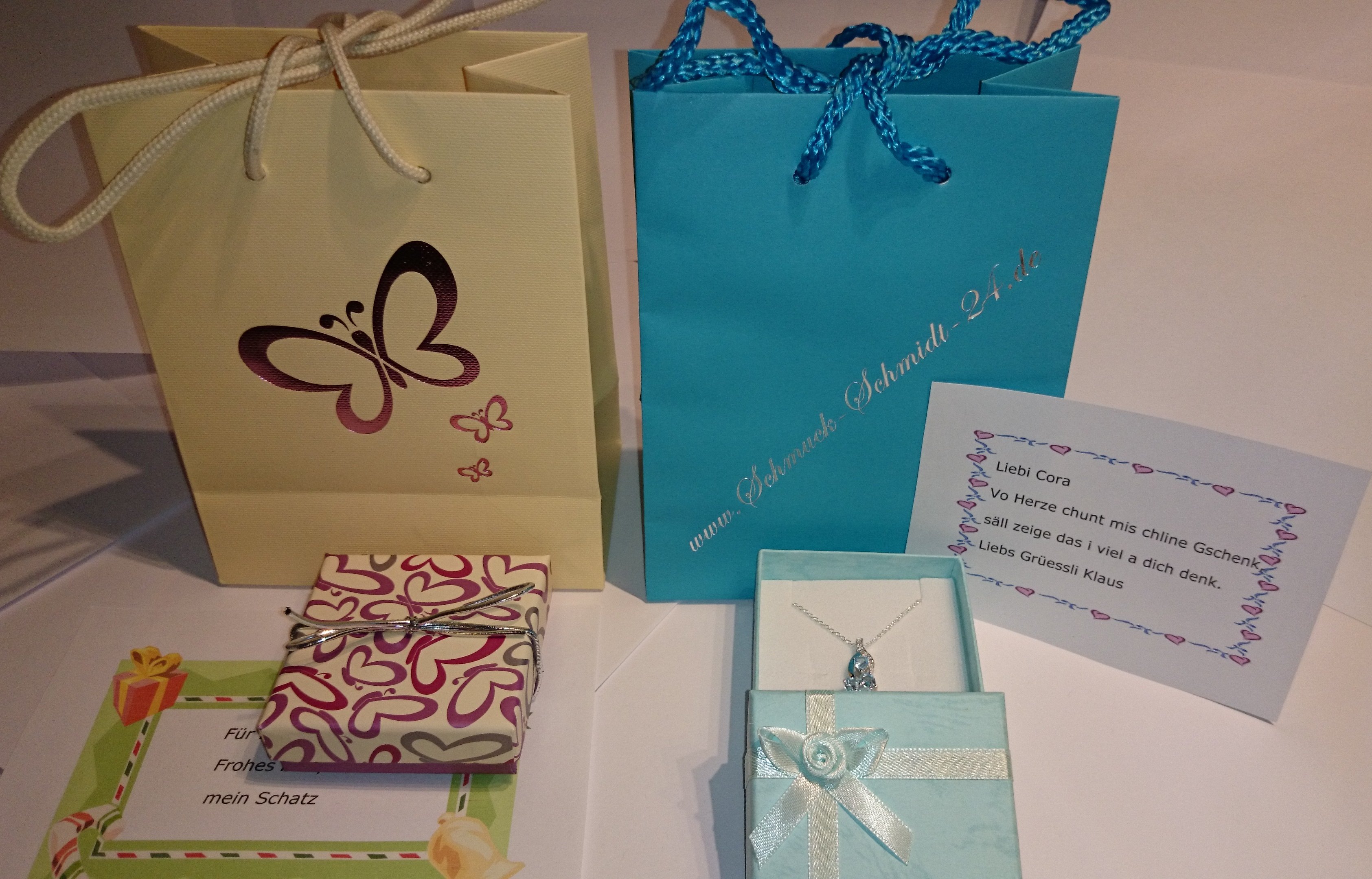 Schreiben Sie uns Ihren gewünschten Grußtext, wir drucken Ihre Grußkarte, verpacken in eine Schmuckbox und alles zusammen in eine Schmucktasche zum Überreichen.