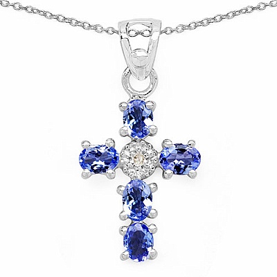In diesem aussergewöhnlichen Collier mit Kreuz-Anhänger wurden Tansanite und ein weißer Diamant in der