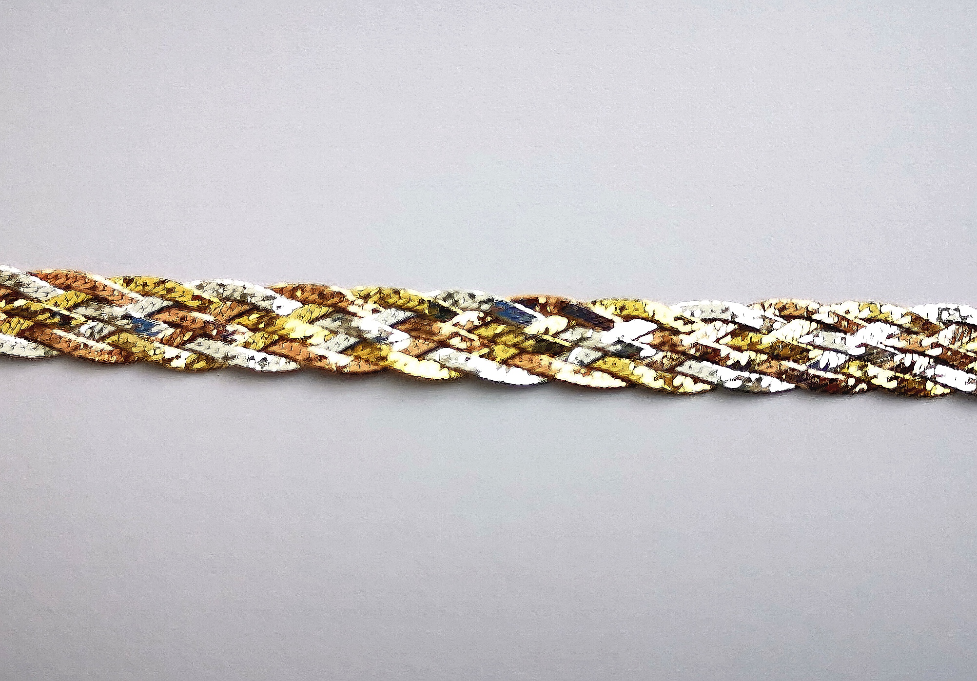 Das Armband ist massiv aus Silber gearbeitet. Ein Strang wurde mit 14 Karätigem Gelbgold vergoldet