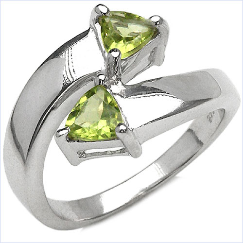 In diesem auffällig gearbeiteten Ring wurden 2 Peridot im Trillionschliff in je 5 mm Größe verarbeitet.